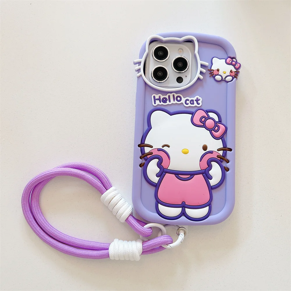 For iPhone 16 15 14 13 12 11 Pro Max X XR Xs Max 6 7 8 3D Cartoon Hello Kitty Silicone Phone Case With Wrist Strap Cute Cover